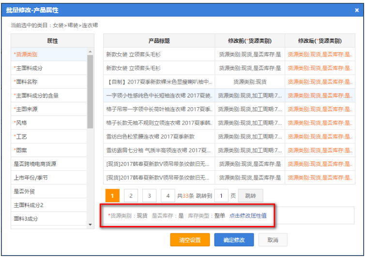 2.在弹出的“批量修改-产品属性”中,我们可以查看到当前选中的类目、产品类目的对应属性、以及产品列表在对应属性的修改前后对比。