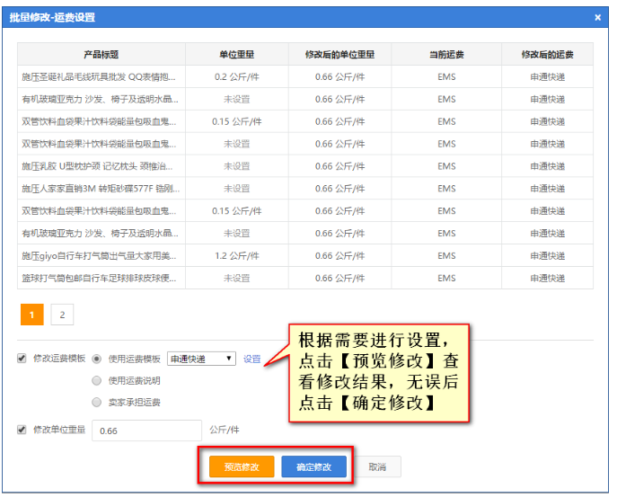 3.设置完成后点击预览,查看设置无误即可点击【确定修改】进行批量运费修改