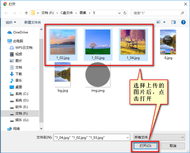 在弹出的本地文件弹窗中选择10张以内的图片,点击【打开】