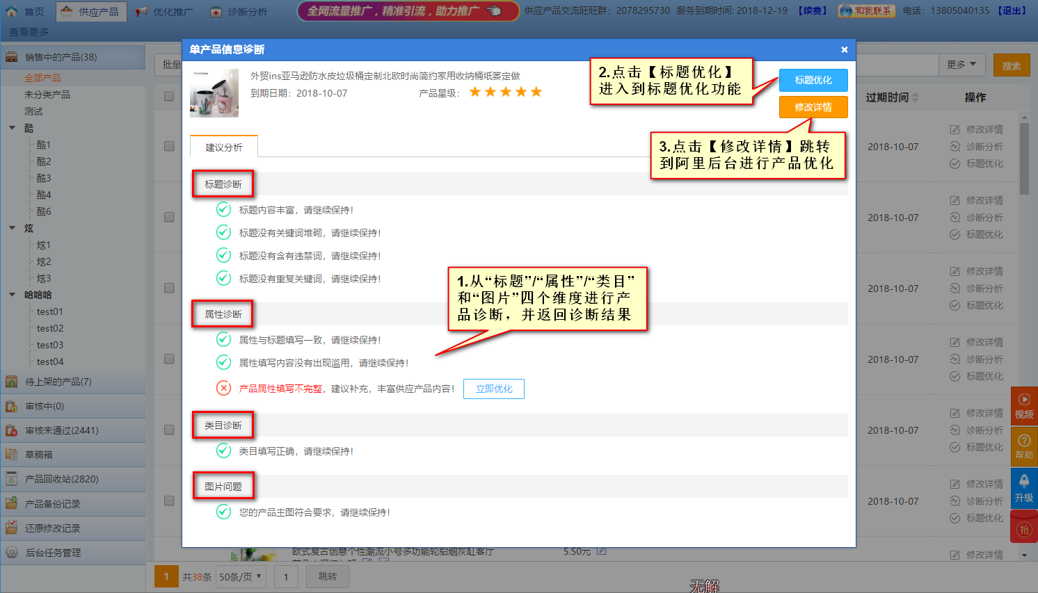 一、销售中/待上架产品列表中,新增“诊断分析”和“标题优化”功能(高级版不限次数/免费版每天限制5条产品)